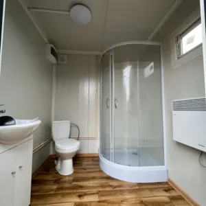 Questa unità autonoma comprende un bagno completo, con cabina doccia separata, lavabo con mobile integrato e scaldacqua istantaneo da 11KW/380V, assicurando acqua calda continua per l’intero sistema. Il pavimento in PVC antiscivolo garantisce sicurezza anche in ambienti umidi.