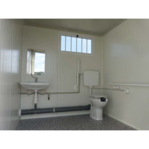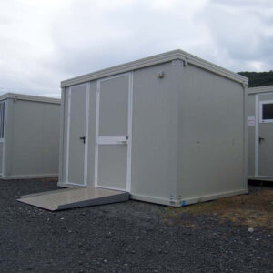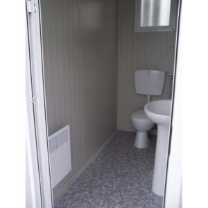 Dotato di porta larga (90 cm di passaggio) con maniglia clinica, griglia di aerazione con inferriata di sicurezza, riscaldamento tramite convettore da 1000 W e boiler elettrico da 50 L. Facilmente trasportabile grazie agli ingressi per muletto e gru, è disponibile anche in altre configurazioni (solo WC, doppio WC).